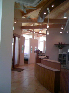 森に入っていくような入り口から進むと、中はアットホームな雰囲気で、窓はステンドグラスでできております。